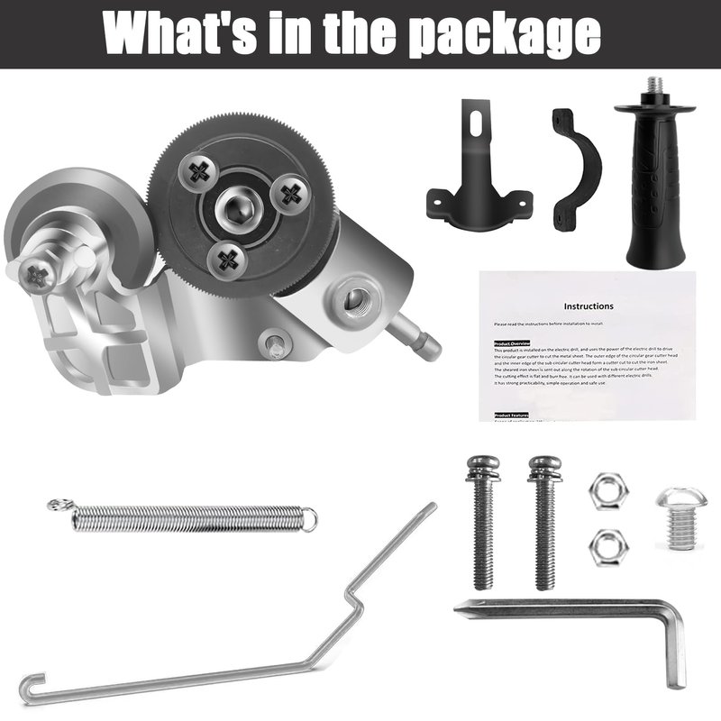 - This sheet metal cutter drill attachment is installed on the electric drill, and uses the power of the electric drill to drive the circular gear cutter to cut the metal sheet.