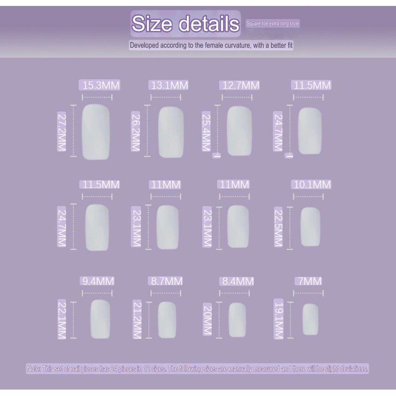 - 24nails in 12 different sizes - various nail sizes ensure a fully customized fit, and we also provide you with extra just in case! Each set comes with a storage box, nail glue, double-sided nail files, small wooden sticks, and alcohol swabs.