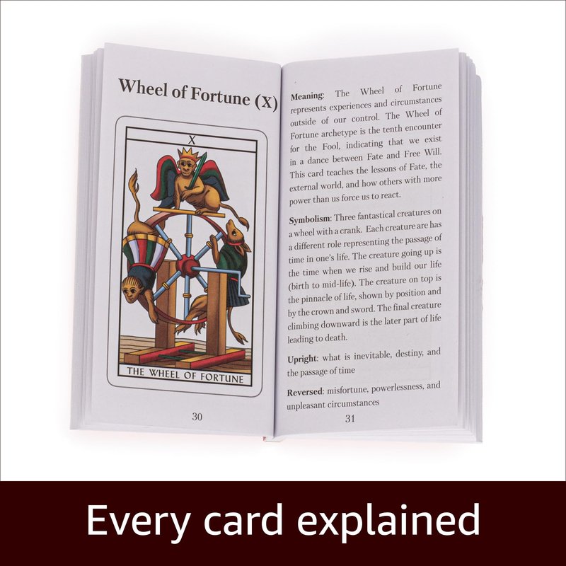 - USEFUL GUIDEBOOK: follows the Rider Waite archetypes and system with color pictures, upright and reversed keywords, and clear descriptions