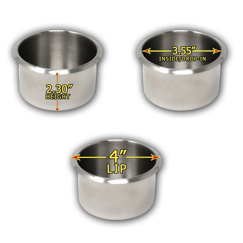 - 3.55 inch inside diameter, 2 3/8 inch tall, 4 inch outside lip diameter. Please note that drink can or bottle with a coozie will not fit.