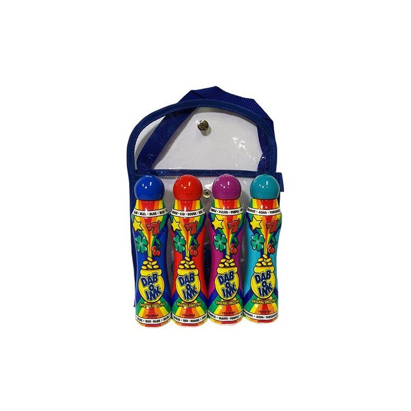 Our gift packs have a vinyl gift bag that holds four 3oz Dab-O-Ink daubers; blue, red, purple, and aqua. This offer saves you some cash, and you get a free form fitted bag to carry your new daubers in! Only at BingoShop!