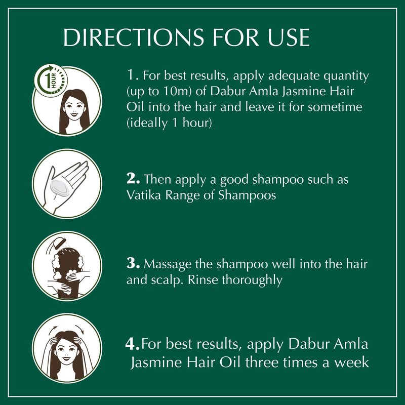 - DIRECTIONS FOR USE: Use your fingertips to gently massage Dabur Amla Jasmine Hair Oil into the scalp and hair. The use of this amla hair oil on a regular basis helps to strengthen the hair and keep it shining longer.
