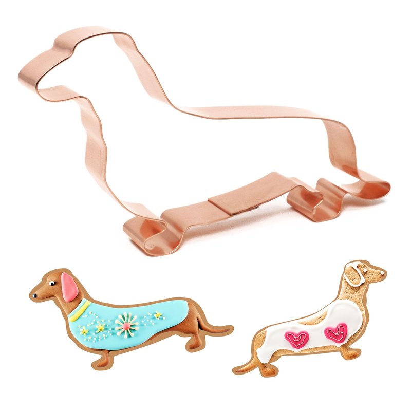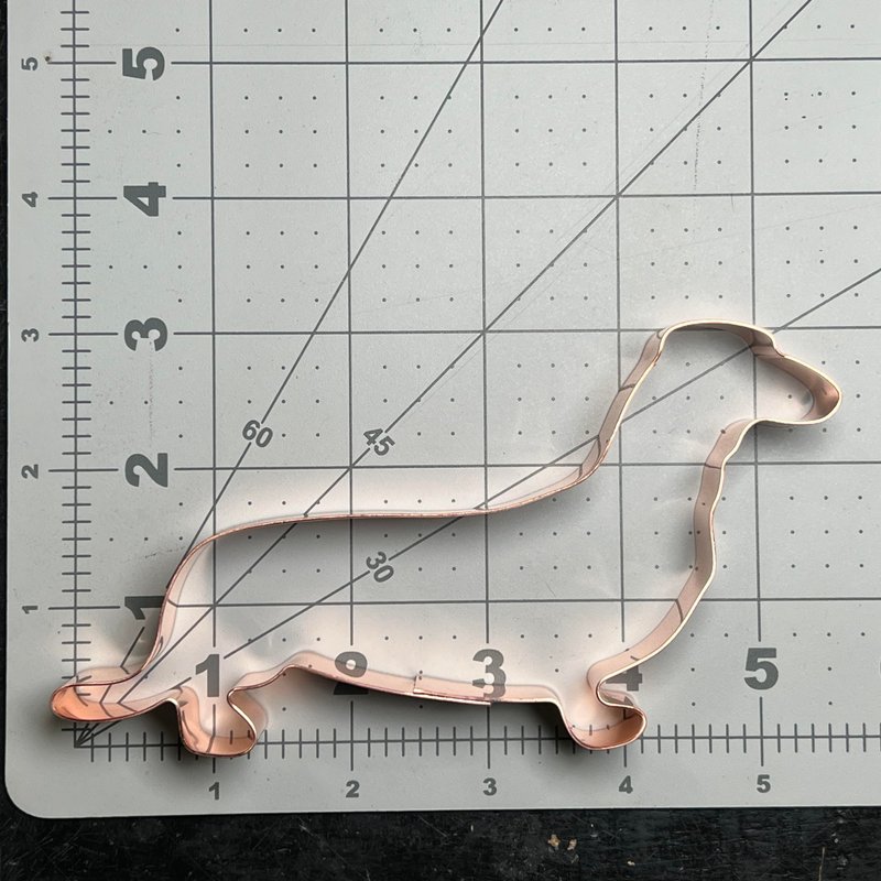 Bring the charming dachshund breed to life in your baking with the Dachshund Dog Breed Cookie Cutter from The Fussy Pup. Crafted from high-quality copper, this 3 x 5.5-inch cookie cutter captures the iconic long and low silhouette of the beloved dachshund. Whether you're baking treats for your furry friend or creating delightful snacks for family and friends, this handcrafted cookie cutter is a must-have for any dog lover's kitchen. With its sturdy construction and precise design, you can enjoy crisp, detailed cookie shapes time and time again. Elevate your baking repertoire and celebrate your love of dachshunds with this delightful kitchen essential. Who wouldn't love a dog cookie cutter from a friend! This dachshund cookie cutter is a perfect dog lover gift. Each cookie cutter is handcrafted in our workshop from heavy weight solid copper. This cookie cutter is built to last for many generations of cookie baking, fondant cutting, Christmas ornament making, or even use it for tracing quilt patterns. Made from very heavy weight copper to maintain shape while using and storing. Great for gift giving or as a centerpiece to a cookie bouquet! Each one is slightly different from the next as they are formed one at a time and hand soldered using lead-free silver solder. Listing is for one cookie cutter.
