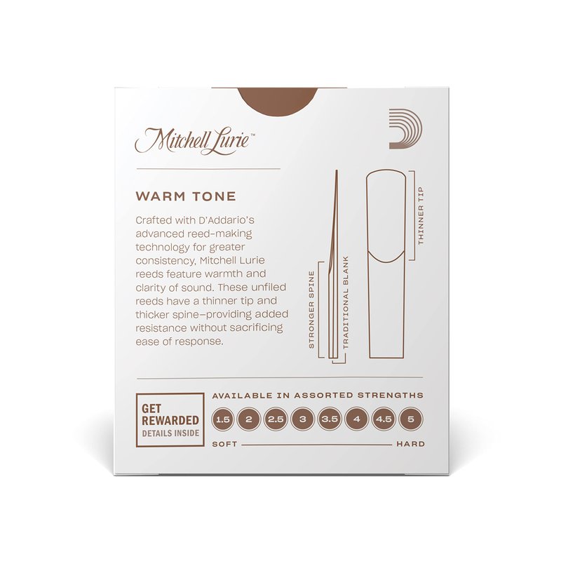 Professionals and students alike benefit from the balance between the superb tone and ease of play of Mitchell Lurie reeds. Mitchell Lurie Bb clarinet reeds are available in boxes of 10.