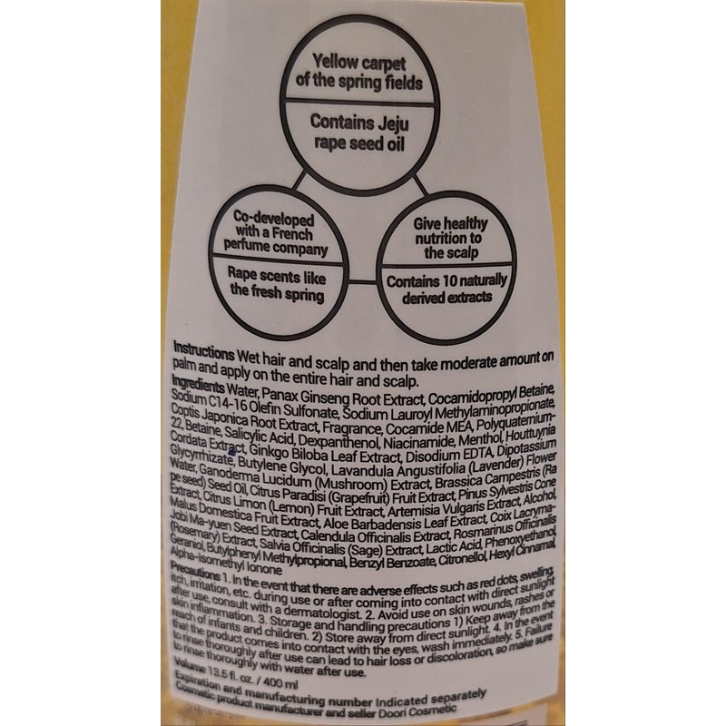 - Infused with the vibrant, sunny hues and nourishing properties of Jeju Island rapeseed oil, it offers a remarkable experience, ensuring the health and rejuvenation of both your hair and scalp.