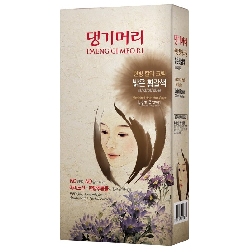 Enhance your hair coloring experience with Daeng Gi Meo Ri Korean Herbal Hair Dye Color Cream. Infused with directly-decocted herbal extracts like Ginseng, Cnidium Officinale, and Mugwort (Artemisia princeps), this ammonia-free formula not only enhances the strength of each strand but also minimizes hair damage and scalp irritation. Achieve vibrant, long-lasting color without compromising scalp health. Our PPD-free formula offers natural-looking gray coverage while nourishing hair from root to tip. Experience the benefits of our patented herbal colorant, soothing the scalp, reducing itching, and promoting overall scalp health. Available in [Light Brown]. Plus, as a bonus, receive the Ki Gold Quick Hair Cover Cushion [Natural Brown] for immediate scalp coverage for thinning hair and hair loss.