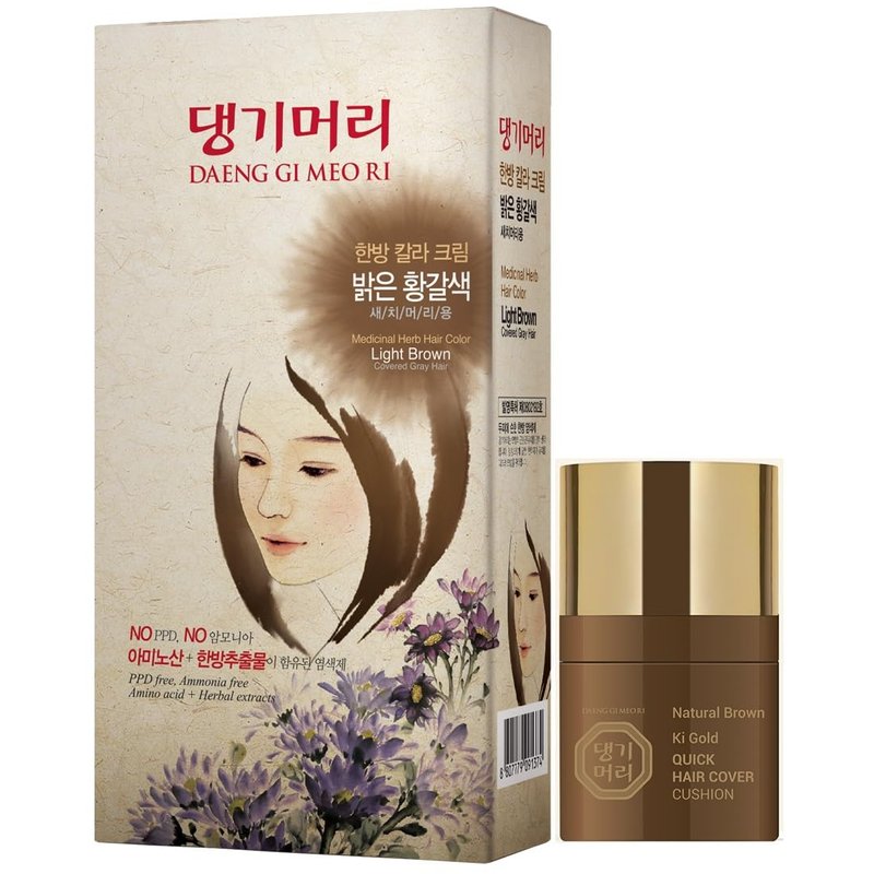 Daeng Gi Meo Ri – Korean Herbal Hair Dye Color Cream [Light Brown] - PPD-Free Gray Hair Protection, High-Keratin Formula, 5 Oz + Ki Gold Quick Hair Cover Cushion [Natural Brown] 8ml