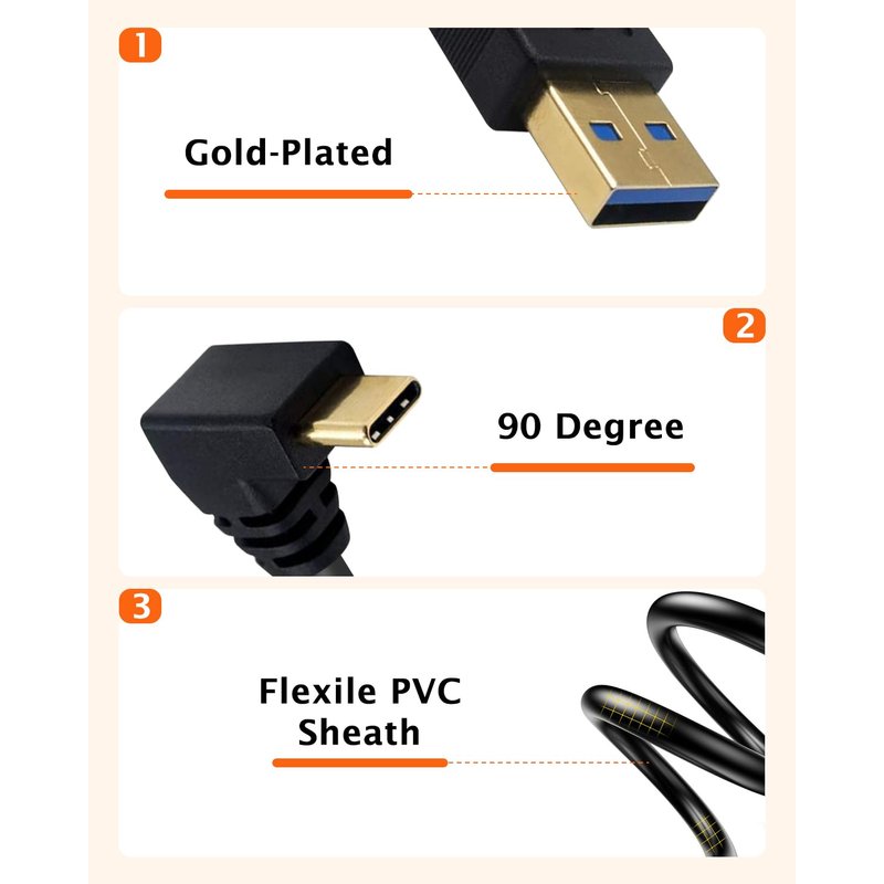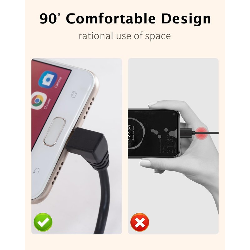 - USB Type C 90 Degree Cable adopts soft PVC sheath, which is light, durable and beautiful. Easy to carry around. Its 90-degree design is user-friendly, it can be used in limited space, but also extend the service life of the cable. Be able to use it at anytime and anywhere. Such as in the office, while traveling, at home and so on.