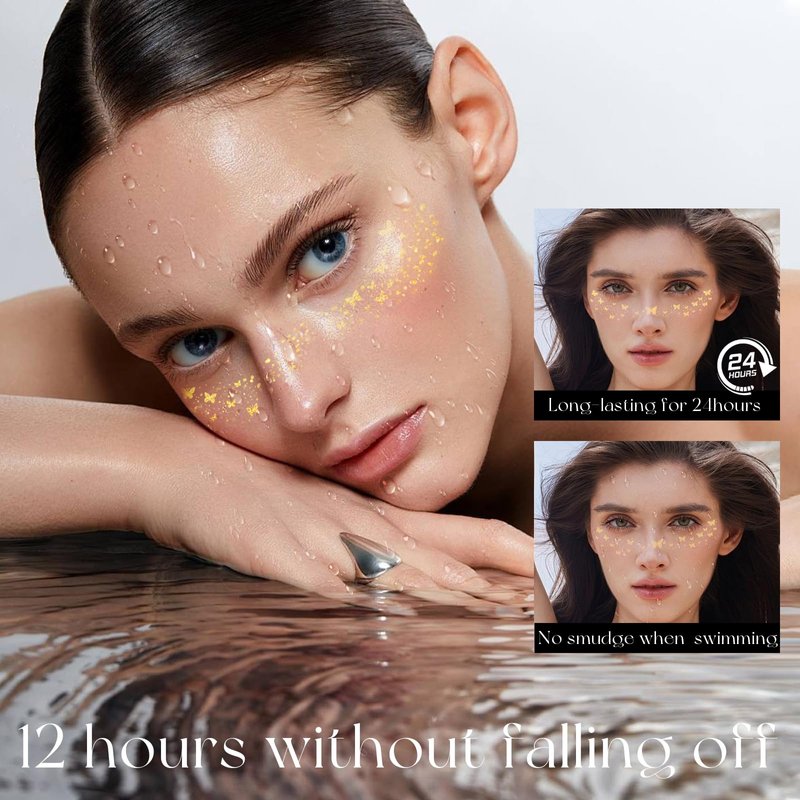 - WATERPROOF: The waterproof formula ensures that the face temporary tattoo remains firmly attached and won't come off when it is exposed to water or sweat; meanwhile, its unique anti-fade features makes the tattoo sticker's luster last as long as new, so that the gold tattoo sticker maintains the perfect visual effect, whether in the party of revelry or daily activities.