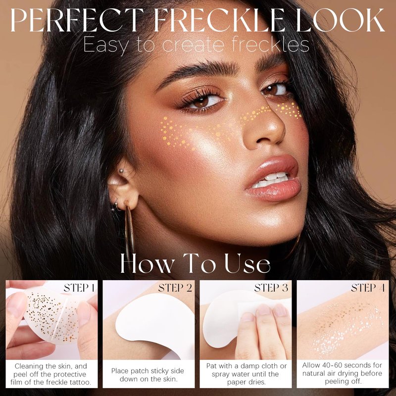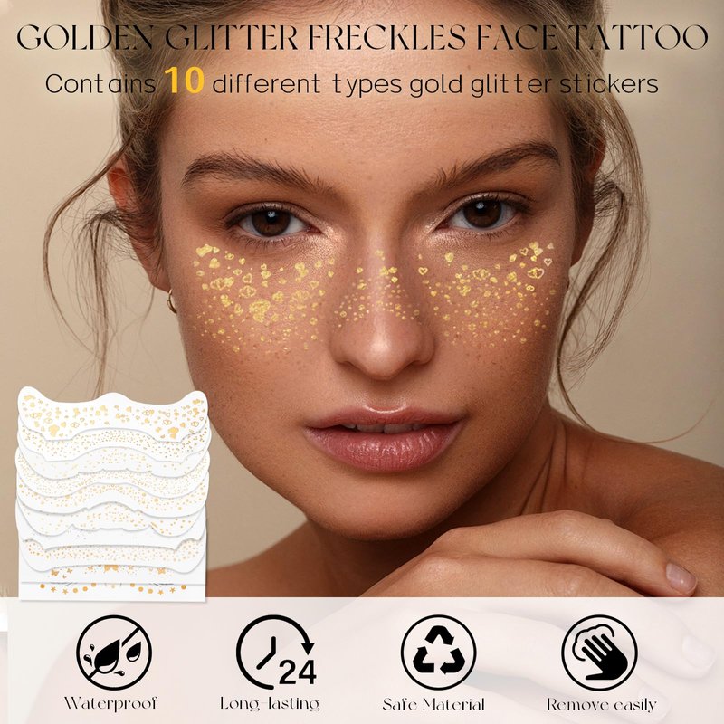 - RICH PATTERNS: This 10-sheet foil glitter freckle tattoo sticker contains stars, dots, moon, snowflakes, freckles,love triangle and other patterns, dynamic and natural. The gold foil design gives the pattern a bright gold foil effect, making you glitter in the light and glamorous.