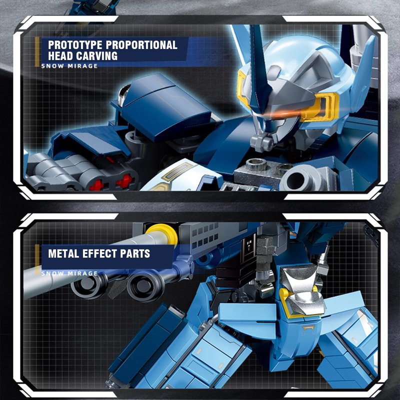 - Mech building blocks: The Snow Phantom mecha is equipped with an anti-mecha sniper rifle and a large-caliber pistol, and wears a cape. The metal special effect parts show a sense of future technology. The multiple joints of the whole body are flexible and movable, and support a variety of postures. Build a mecha model and assist the mecha troops to jointly protect the city.