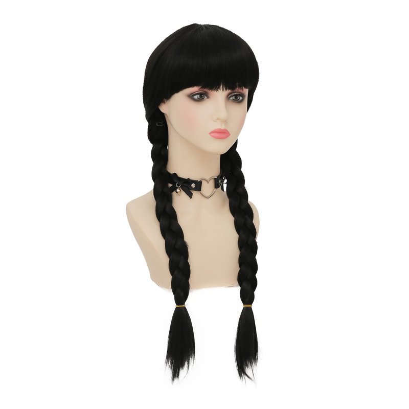 - This synthetic fiber wig features long black pigtails with center part and two braids, just like Wednesday wears her hair.