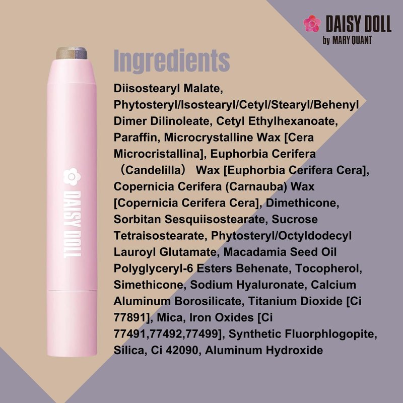 Elevate your eye makeup game with the Daisy Doll Dual Color Eyeshadow Stick. This innovative eyeshadow crayon features two complementary shades in one, allowing you to blend, layer, or wear each color individually. Its highly pigmented formula delivers bold, lasting color with just one swipe, while the creamy texture glides smoothly onto your eyelids for effortless application. Enriched with moisturizing ingredients, this eyeshadow keeps your eyelids comfortable and hydrated all day. Perfect for on-the-go use, the compact design makes it easy to create stunning eye looks, whether you're at home or traveling. 【INGREDIENTS】Diisostearyl malate, cetyl ethylhexanoate, dimer dilinoleate (phytosteryl/isostearyl/cetyl/stearyl/behenyl), paraffin, candelilla wax, microcrystalline wax, carnauba wax, dimethicone, sorbitan sesquiisostearate, tetraisostearate Sucrose, di(phytosteryl/octyldodecyl) lauroyl glutamate, macadamia nut oil polyglyceryl-6 ester subbehenate, tocopherol, simethicone, sodium hyaluronate, titanium oxide, iron oxide, synthetic fluorophlogopite, mica, silica, aluminum hydroxide, tin oxide