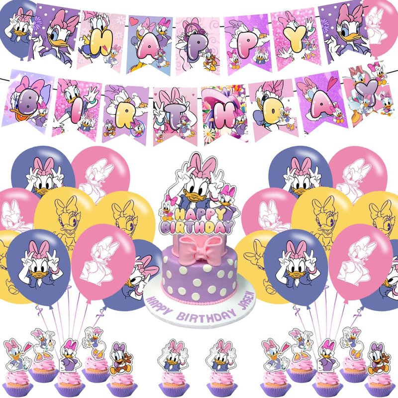 - Daisy Duck Package Including: 1set happy birthday banner, 1 cake topper, 12 cupcake toppers, 18 Latex Balloons with 3 designs. Abundant styles for you and your guests an unforgettable and surprise birthday party.