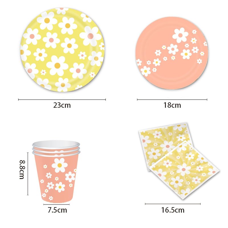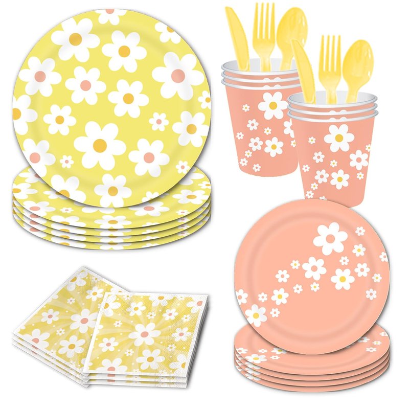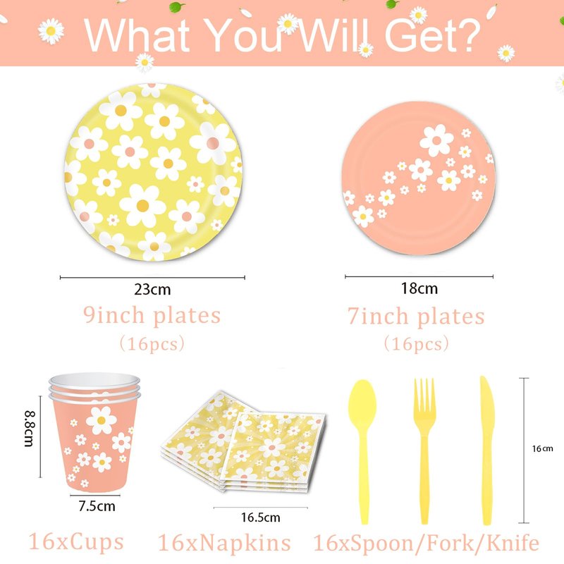 - You Will Get: Simplify your party planning with our all-in-one set. The daisy party supplies includes 16pcs 9'' daisy dinner plates, 16pcs 7'' daisy dessert plates, 16pcs daisy napkins, 16pcs plastic knifves, 16pcs plastic forks, 16pcs plastic spoons. Everything you need to create a vibrant and cheerful atmosphere.