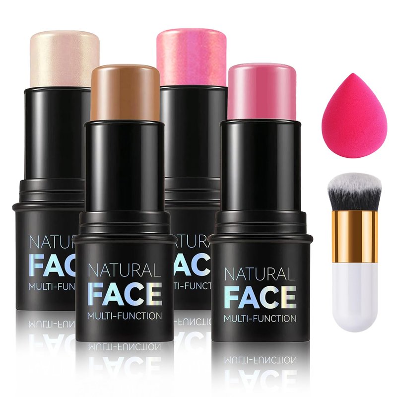 6PCS makeup contour kit,the kit includes a highlighter stick,2 blush sticks,a bronzer stick,a brush and a sponge puff,which are easy to mix and professionally create a three-dimensional facial effect.1.Light and moisturizing,cream texture,light and smooth,blends seamlessly with the skin,effectively hides pores and blemishes;innovative moisturizing ingredients nourish the skin to create vibrant and healthy skin.2.Enduring elegance,contour sticks use a professional long-lasting formula with excellent waterproof effect,which can maintain a fresh and elegant makeup all day in hot or humid environments.3.Versatile glamour,highlighter sticks can naturally brighten the skin tone;dark and light blush can meet the needs of different makeup,add rosy luster to the face,and enhance the complexion;bronzer sticks can enhance the three-dimensional effect of the face.