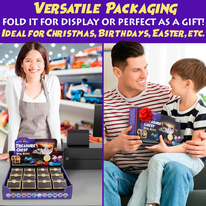 DANCING BEAR Treasure Chest Dig Kit Party Pack for 12 Kids, Excavate 12 Surprise Real Gems & Crystals, STEM Education, Fun Pirate Booty Hunt, Science Activity Gift Sets for Girls and Boys