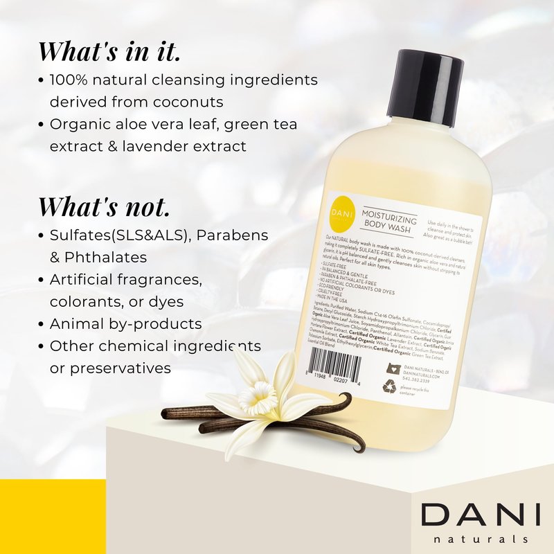 - GREAT FOR SENSITIVE SKIN: DANI Naturals Moisturizing Body Wash is pH balanced and incredibly gentle. The 100 percent sulfate free formula is made using only natural, coconut-derived cleansers, making it great for sensitive skin.