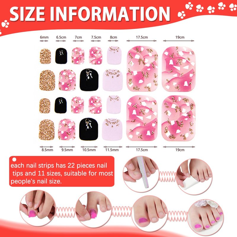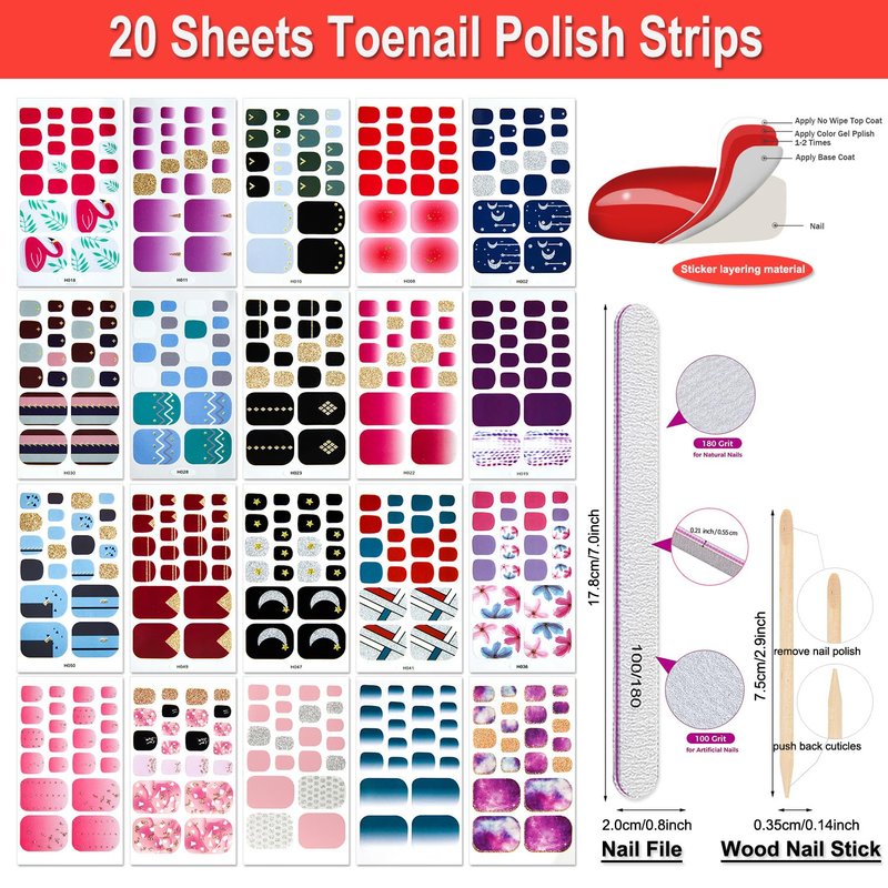 - [Package Included] you will get 20 sheets nail polish strips for toe, each nail strips has 22 pieces nail tips and 11 sizes, to suitable for most people's nail size. the attached nail file and cuticle stick will help you finish the nail work better.