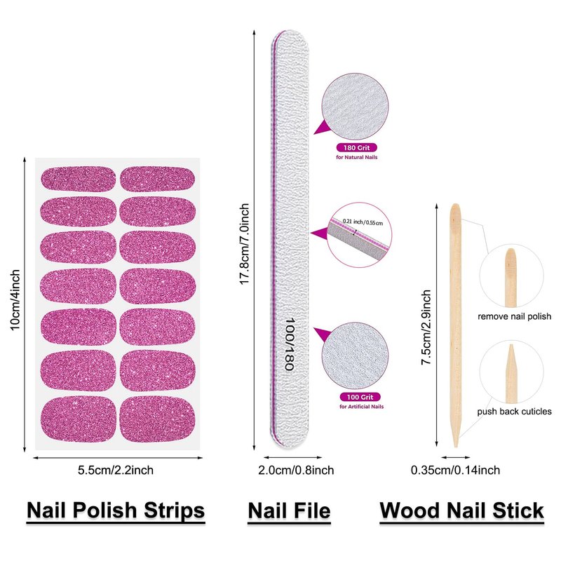 - [Package Included] you will get 24 sheets glitter nail stickers, each nail strips has 14 pieces nail tips and 7 sizes, to suitable for most people's nail size. the attached nail file and cuticle stick will help you finish the nail work better.