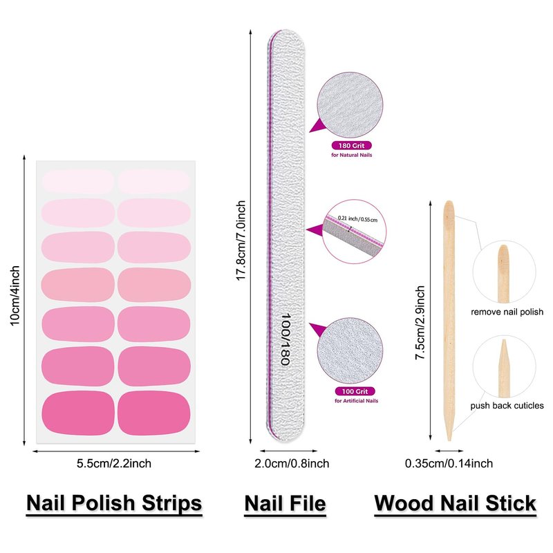 - [Package Included] You will get 24 sheets full nail strips, each nail strips has 14 pieces nail tips and 7 sizes, to suitable for most people's nail size. the attached nail file and cuticle stick will help you finish the nail work better.
