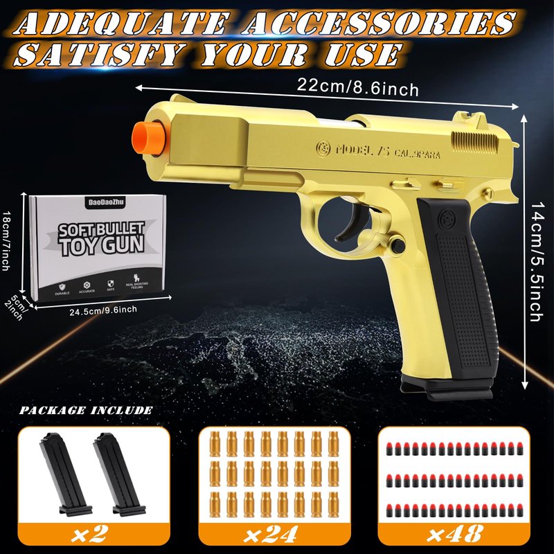DaoDaoZhu Soft Bullet Toy Gun Shell Ejecting with 48 Bullets, Gold Toy Guns for Boys, Toy Pistol Fidget Gun, Realistic Play Gun Model, Halloween Christmas Birthday Gifts for Boys Kids Adults Age 8+