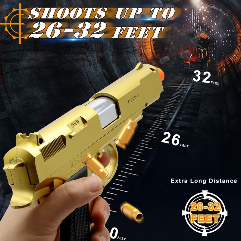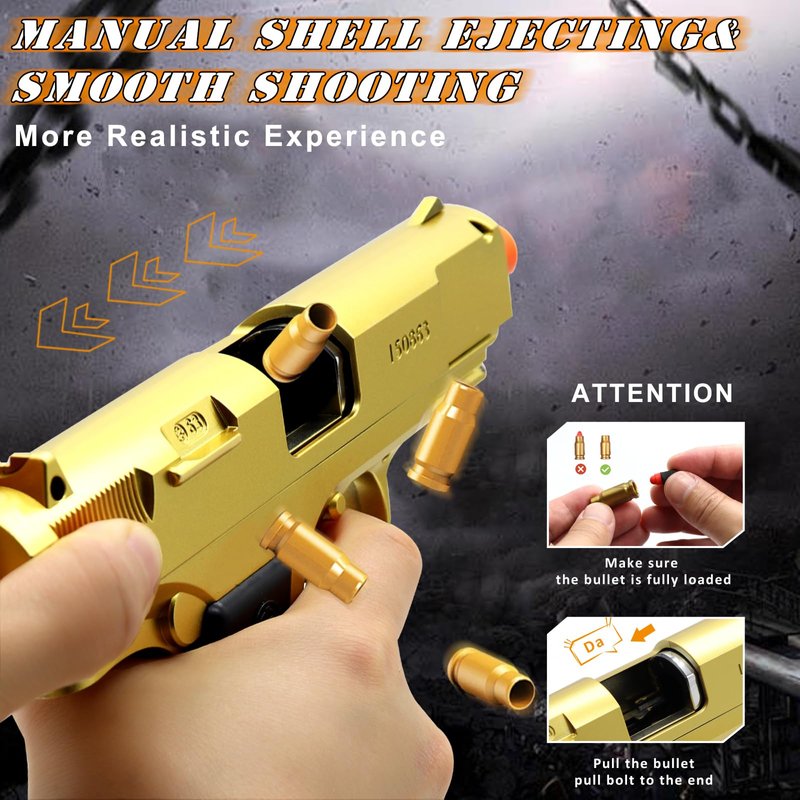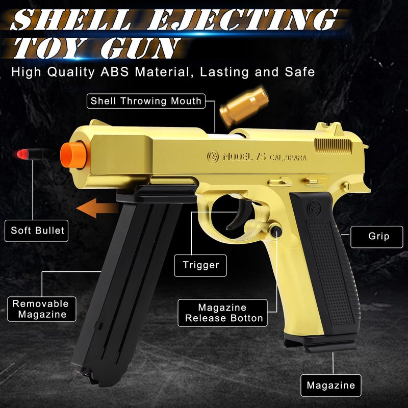 - [Secure and Long-lasting Materials] Crafted with soft bullets and a long-lasting ABS body, our shell ejecting toy gun with soft bullets is designed to prioritize safety for both kids and pets, giving parents reassurance while their children play. This gold toy gun pistol has passed ASTM, CPC and CPSIA certifications, which is a trusted choice for you!