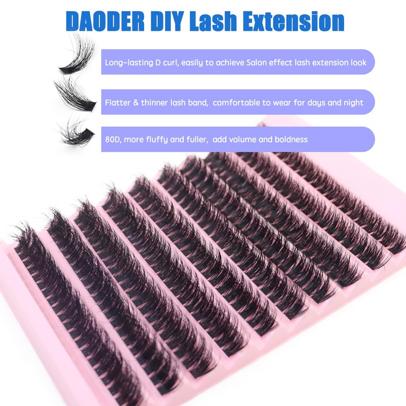 - 80D THICK FLUFFY EYELASH EXTENSION KIT: DAODER lash clusters kit includes: 200pcs 80D D curl thick & fluffy lash clusters with10-16mm mixed length; 10ml* lash bond and sea, 1* lash tweezers. You can easily DIY eyelash extension look at home with less time and money, even if beginners.