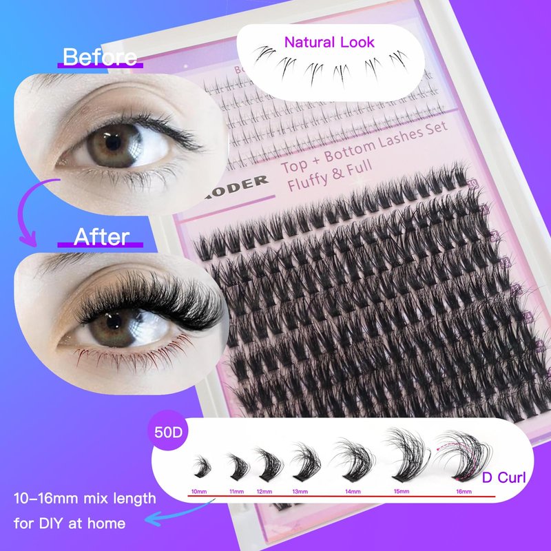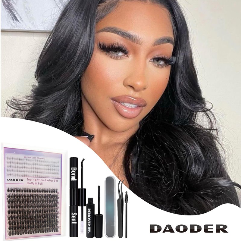 - đ ăLash Extension Kit With Bottom Lashesă- Why need bottom lash clusters but not mascara? The bottom lashes clusters can add extra length and definition to your under eye lashes without fake-looking, make eyes bigger and pop, balance out the eye look, but mascara may lead to clumpy smudge potential. So, complete your entire look with top and bottom lash clusters kit. DAODER invisible band bottom lashes add subtle to moderate length while the 50D fluffy light volume lash clusters add flare and fullness for an incredibly natural-looking, realistic result