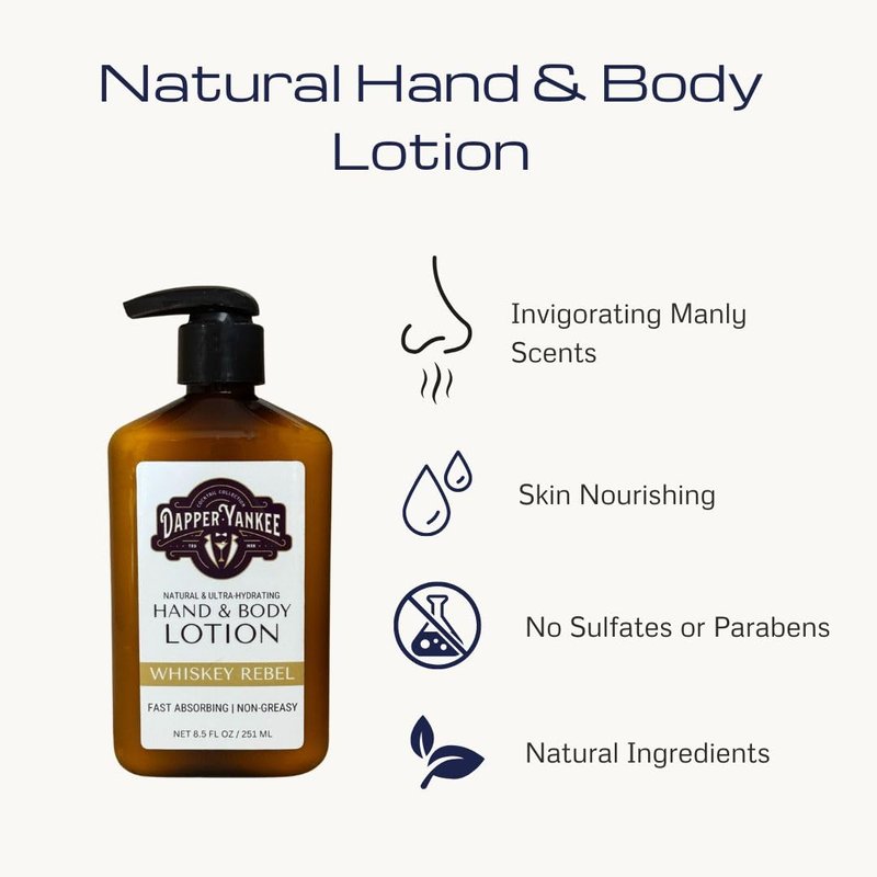 Dapper Yankee Natural Hand & Body Lotion for Men - Whiskey Rebel - Vanilla Whiskey Scent, Moisturizing, Non-Greasy, Fast Absorbing