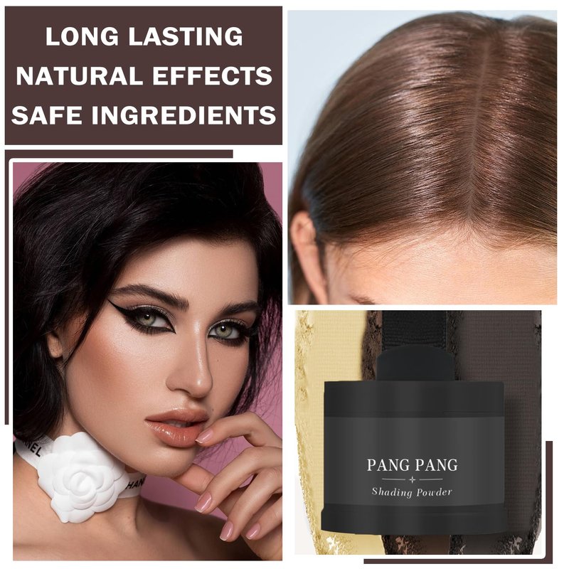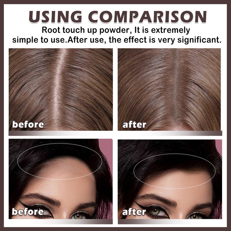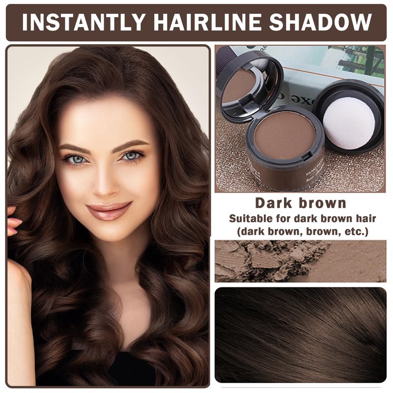-Hairline powder comes in two different colors: dark brown, chestnut brown, golden yellow and black. You can choose a color that you like or that is close to your hair. -Root cover up powder covers gray hair at the root, baldness or receding hairline, can easily hide thinning hair and make your hair thicker. -Root touch up powder can also be used as a brow powder to fill in your brows.