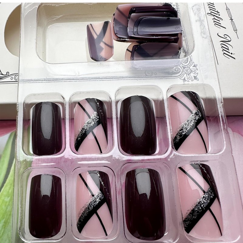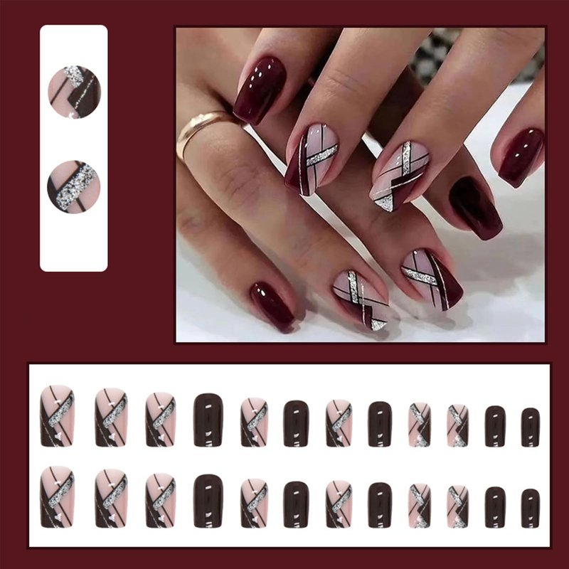 Dark Red Press on Nails Short Medium Length Square Silver Fake Nails with Glitter Line Designs Glossy Full Cover Acrylic Nails Stick on Nails Artificial Reusable False Nails for Women Manicure 24pcs