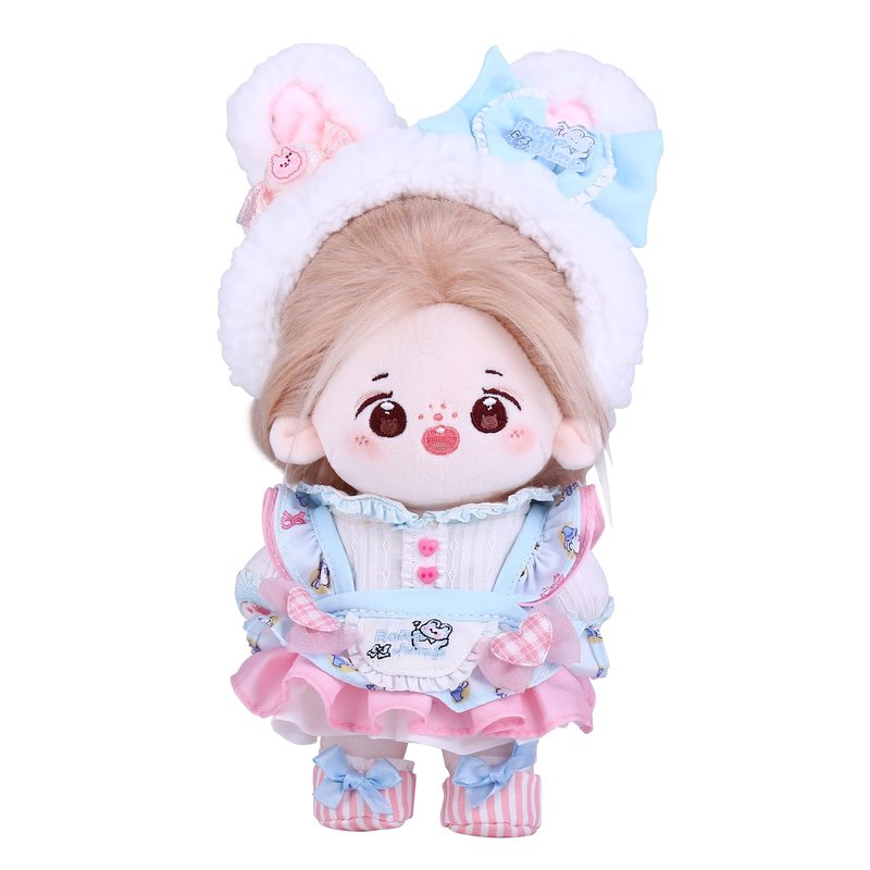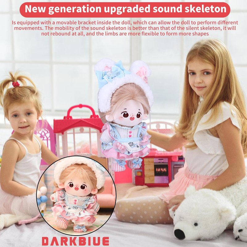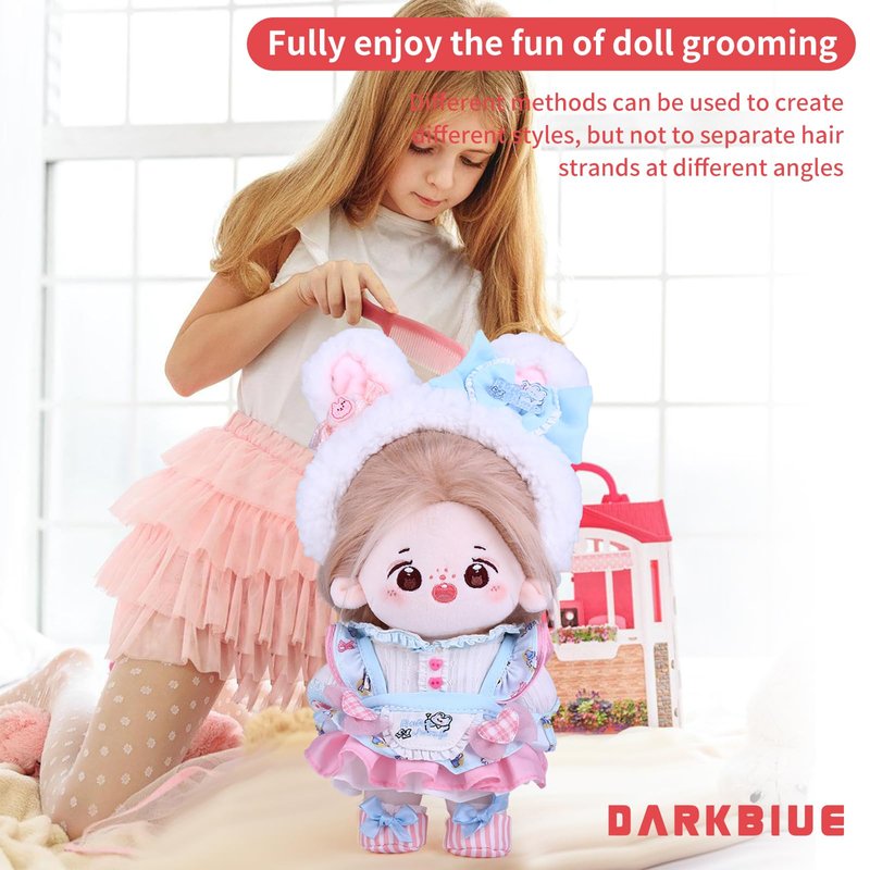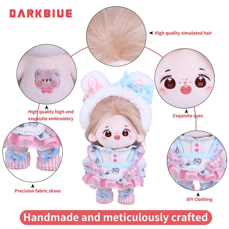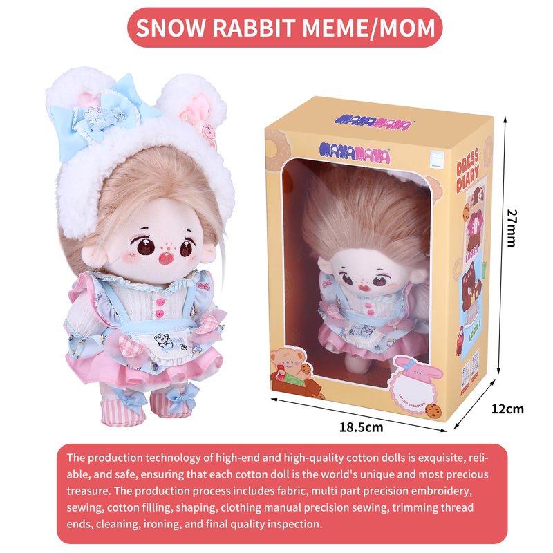 1,DARKBLUE brand's latest generation of 20CM Plush Doll Long Hair (cotton dolls) Girl, with a sound skeleton and clothing doll set;The Darkblue brand Cotton Baby family is a group of cotton babies from different planets who live together on Earth. They are curious about the world and hope to bring energy and curiosity, comfort, happiness, and creativity to humanity;Each cotton doll is meticulously crafted by hand, giving the little one a soul to accompany and protect. They are all the most precious treasures in the world. With sincerity, we will pass on the beauty of this handmade doll to you, let us keep this beautiful sentiment in our hearts 2,Doll ID Name: SNOW RABBIT MOMO, Date of Birth: July 25, 2023, Leo, raised by 20CM, Little Sweet Bean is a quirky little sister with bright big eyes. Full of curiosity about the new world, she always has wild thoughts. When she is feeling down, she gently comforts her and carefully takes care of her innocence. If love is companionship, Our time guarding each other is the memory of our memories, just like loving another self in the world. Healing and growing together, as long as we are by each other's side, they will feel happy about you 3,Doll Brand Story: SNOW RABBIT MOMO studied at Melores Rose Academy and was a popular and beautiful girl in her class. She learned to work at her sister's dessert shop on Fridays after school, and her best dessert was peach and snow. She often shared her desserts with her classmates, and her dream was to become a sweet girl idol. Girls all love sweet desserts On the first day of school, YOYO shared with MOMO the peach and snow fairy she had made. YOYO was conquered by the sweet smile and cute personality of Xiaotiantian, and deeply fell into the trap Xiaotiantian is good at divination and has a very rich imagination and creativity. Her delicate and sensitive inner world makes her considerate towards the people around her and willing to share the beautiful things in life When she is with Xiaotiantian, her energetic smile always infects her. They heal and grow together. As long as they are by each other's side, they will feel happy. 4,Doll with Cotton Doll's Elite Set: Four point clothing (small rabbit hair clip, one set of blue LOTILA dress, one pair of fabric shoes), with a built-in sound skeleton, can be arranged in different styles 5,cute dolls kawaii,cotton doll,anime plush