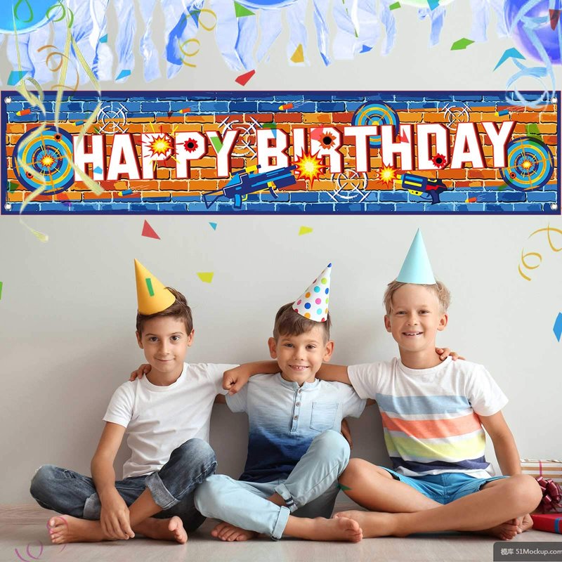- Packing includes: a piece of dart battle happy birthday banner backdrop, size is 5.9 x 1.3 ft/ 1.80 x 0.4 meter, comes with a 13.1 ft/ 4 meter white string; Big enough to suit dart game theme parties, and well satisfy most photo requirements