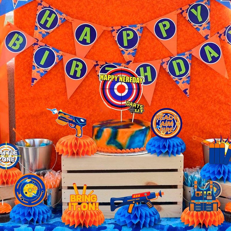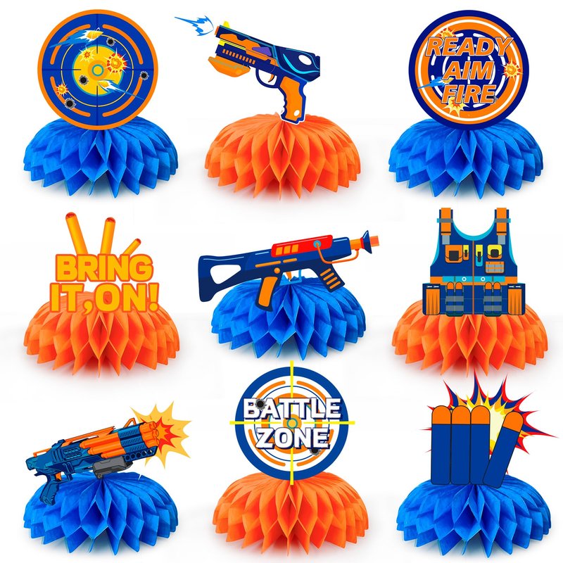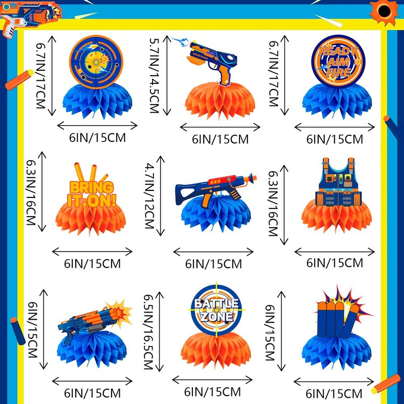 - Dart War Gun Party Honeycomb Centerpieces Set: There are 9pcs dart war birthday honeycomb centerpieces in the dart war party decoration pack, and they can not only meet your needs for dart war birthday decorations and dart war party decorations, but also create a strong festive atmosphere for your dart war party.