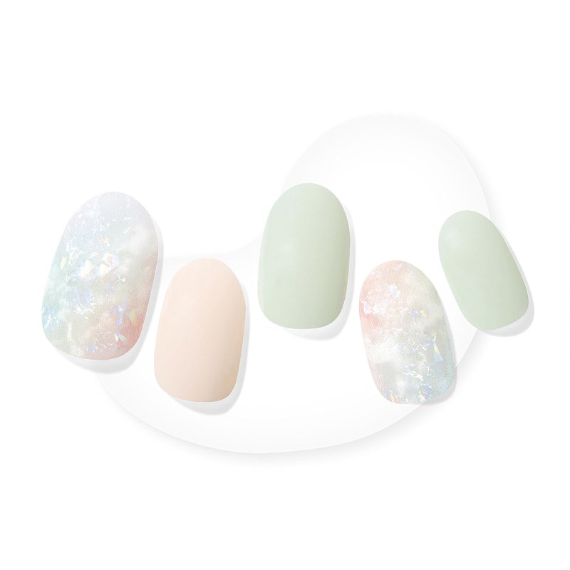 Get down-to-earth with a rare set of natural, neutral beauty. Semi-cured soft green & amp; beige gel nail strips featuring & nbsp; iridescent marble accents with mega volume & amp; maximum shine.