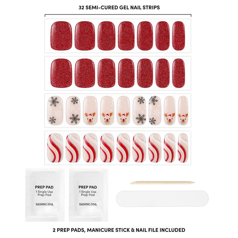 - JOLLY AND BRIGHT: Shining brighter than a red nose reindeer. Semi-cured glittered red & semi-sheer nude pink gel nail strips featuring champagne glitter, abstract swirls, snowflake accents, and reindeer icons with mega volume & maximum shine