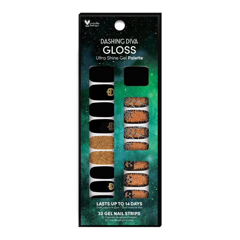 A glamorous twist on a not-so-scary nightmare! Black gel nail strips featuring orange glitter, spiderwebs, and gold pumpkin appliques with a glossy, high-shine finish. INCLUDES: 32 gel manicure strips (20 base color, 12 accent), 1 prep pad, 1 nail file