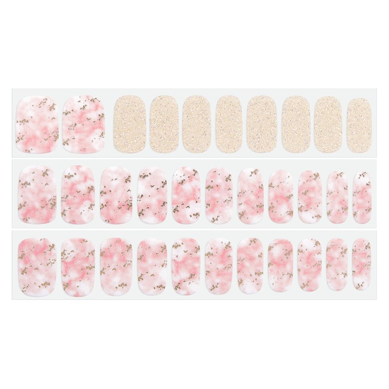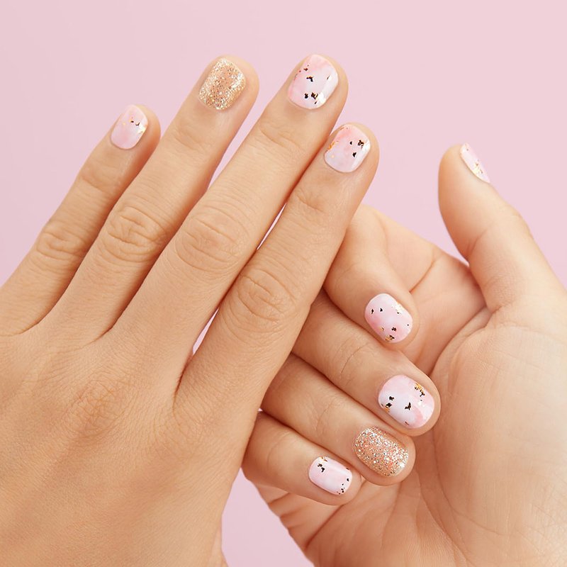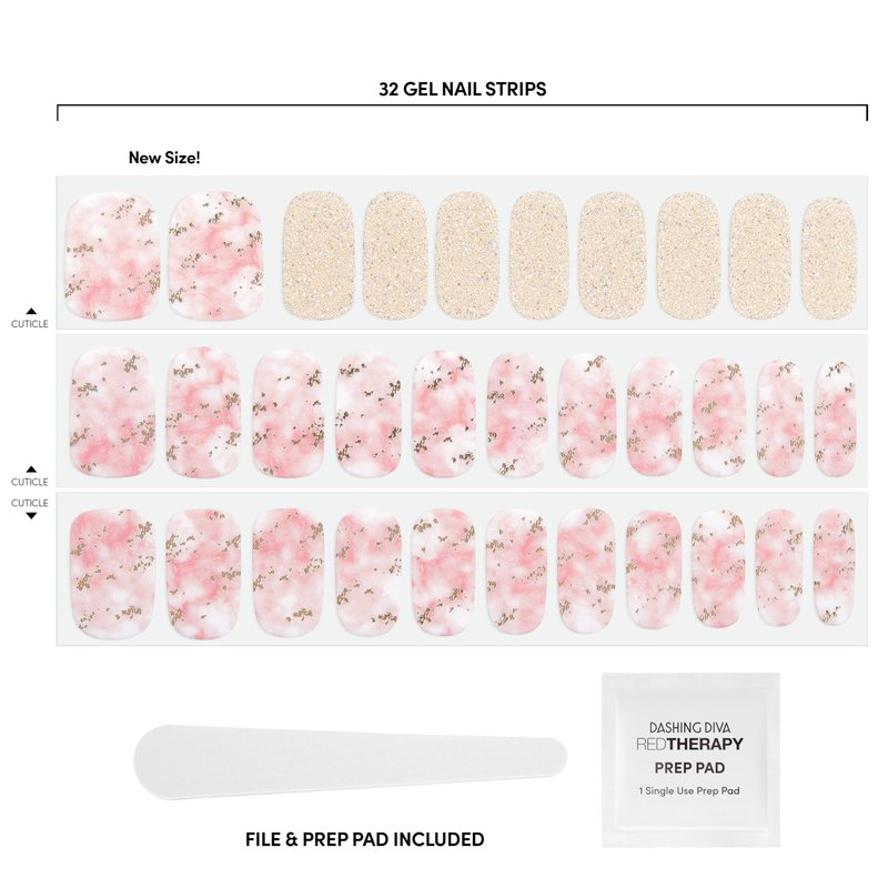 - PRISTINE PEARL: A trio of simplistic, timeless glamour. White & blush pink gel nail strips featuring gold glitter with a glossy, high-shine finish