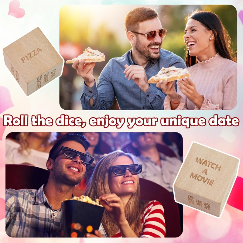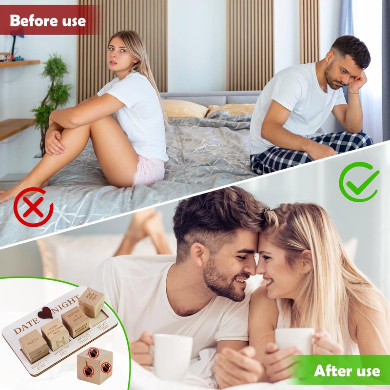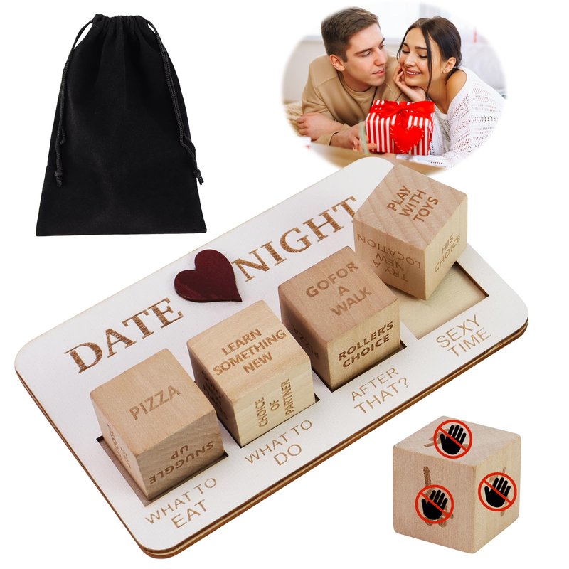 - Date Night Dice Set: This set includes five dice, a wooden board for placing the dice, and a black storage bag. The dice contain five different themes: food decision-making, dating decision-making, entertainment decision-making, interaction decision-making, and romantic decision-making, helping you make decisions easily.