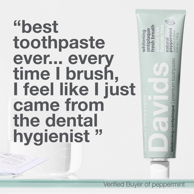- Fluoride-Free Toothpaste: Davids replaces fluoride and other common toothpaste chemicals with high-performing ingredients to effectively reduce plaque, naturally whiten, and freshen breath.