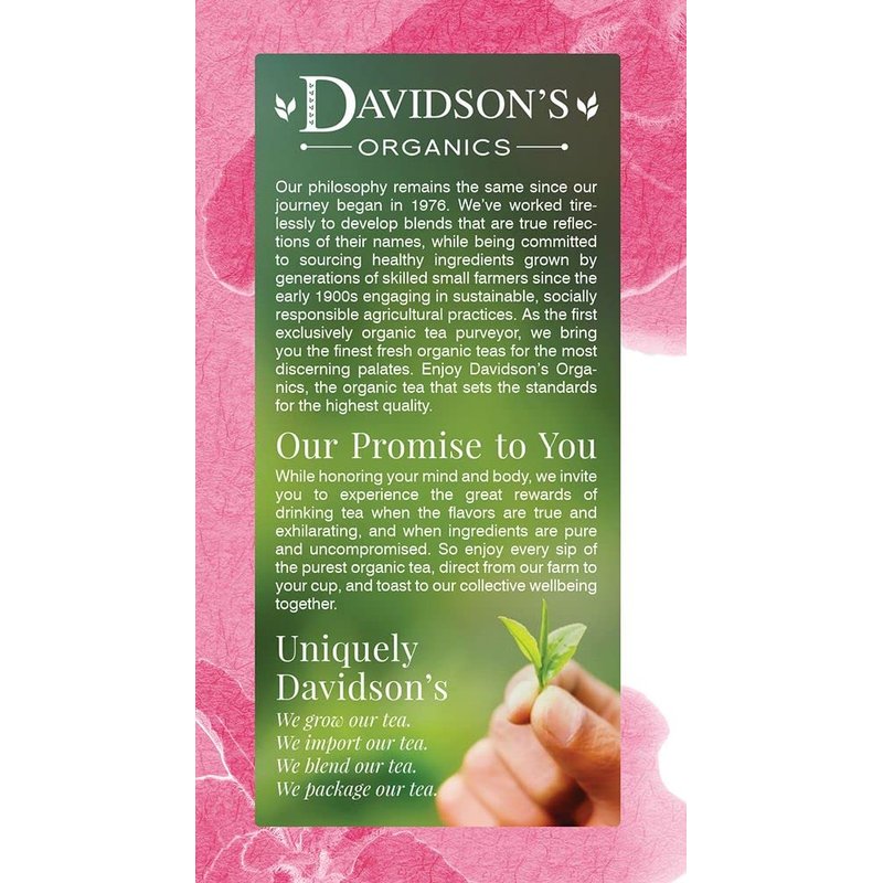 - TRUST OUR TEA: Davidson's Organics was the first purveyor of fine organic teas. Since 1976, we’ve worked tirelessly to develop blends that are true reflections of their names, while being committed to sourcing healthy ingredients grown by generations of skilled small farmers. Enjoy Davidson's Organics, the organic tea that sets the standards for the highest quality.