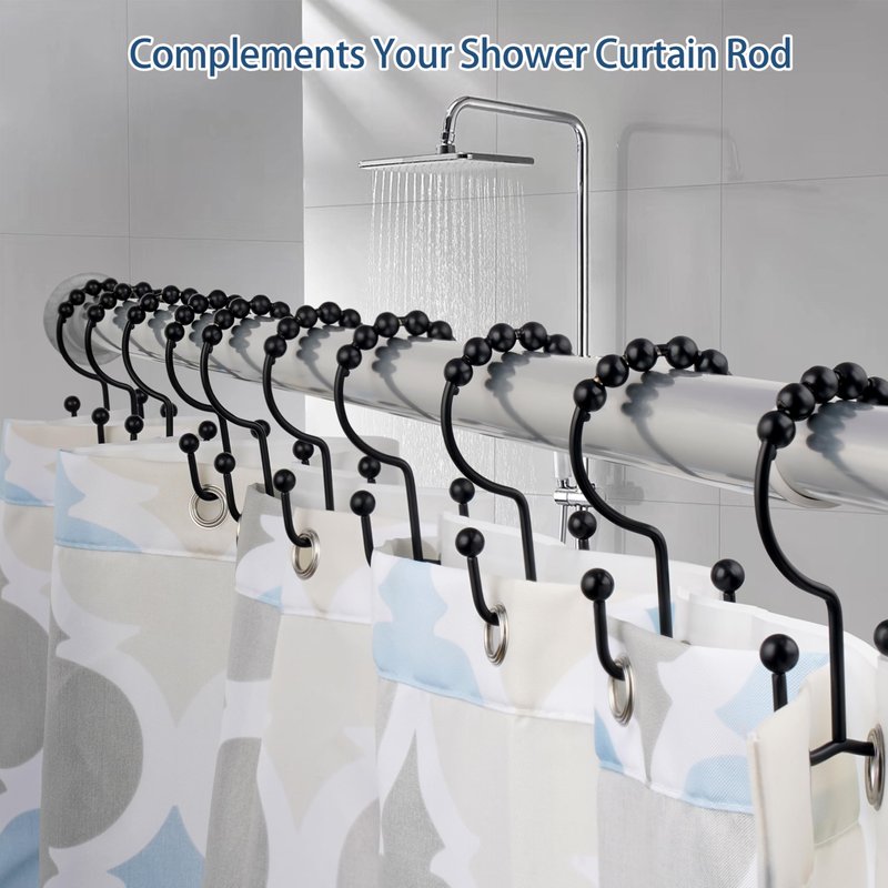 DAWNER Shower Curtain Hooks Rings, Rust Proof Hooks, Metal Easy Glide Double Shower Rings Hooks, Stainless Steel Shower Curtain Hangers for Bathroom Shower Curtains, Set of 12 Hooks, Matte Black