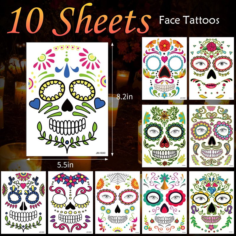 - Healthy and Durable: The day of the dead face stickers are made of pure natural plant ink and cosmetic grade glue, no harm to your skin. Healthy environmentally and colorful. The safe tattoo is also water and sweat resistant and lasts for 2-5 days after a single application. Suitable for all ages, even your kids can enjoy the halloween tattoos temporary with you.