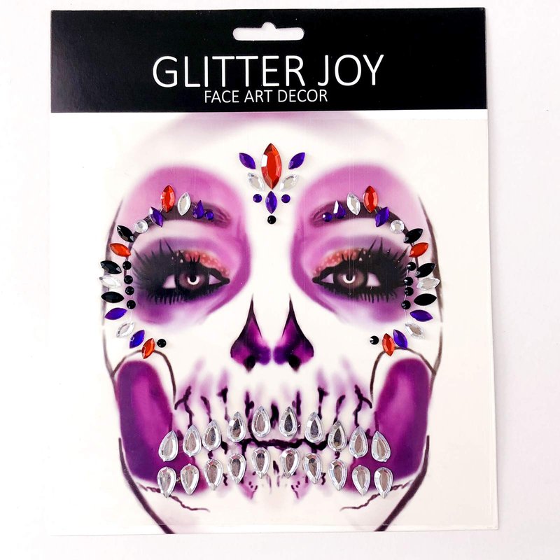 - Rhinestone Skull Face Jewels - 4 different styles unique day of the death face gems tattoo sticker. Complete your festival outfit off with these amazing gems! Use these crystal holographic face jewels along with glitter to accent your beautiful makeup