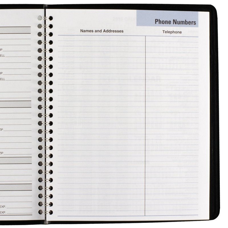 - Memo section with notes space; Julian dates; printed in blue and black ink on quality paper containing 30% post-consumer waste; black simulated leather cover; 7.38 x 9.13 x .38 inches overall