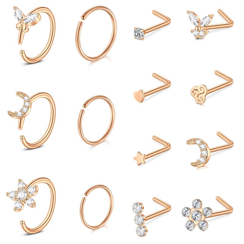 - ✿[Package] 8pcs rose gold nose rings studs + 6pcs nose hoops, total 14pcs nose piercing jewelry With a Black Velvet Pouch;