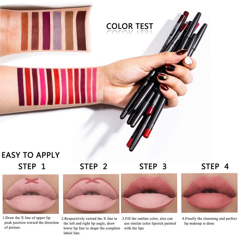 Long lasting lip liner enhances your lips, soft texture is perfect for shaping the lip, balance out irregularities in lip shape and prevent lipstick and lip glosses from feathering and blossom.
