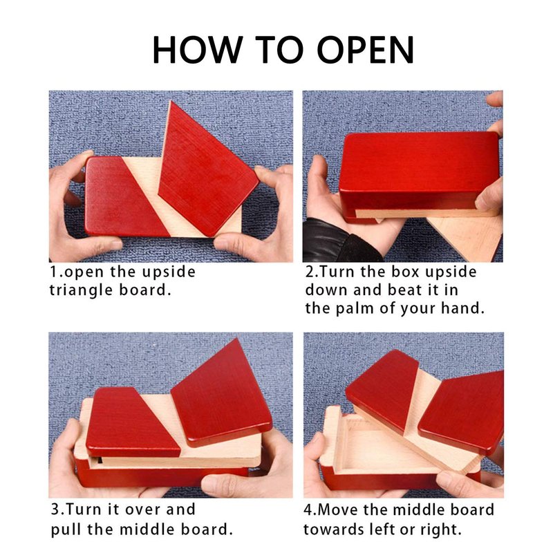 - How to open: ❗Step 1: When receive the puzzle box, please place the box sideways on palm, then move the largest half board firstly.❗ Step 2: Turn down the upper side, and beat the shorter half board or the short side next to it. If it is not opened at the first try, please repeat the operation for more times. ❗Step 3: After the operation above, the middle board can be moved left or right, then put the small gift in the inner space, then lock the box with inverted order.