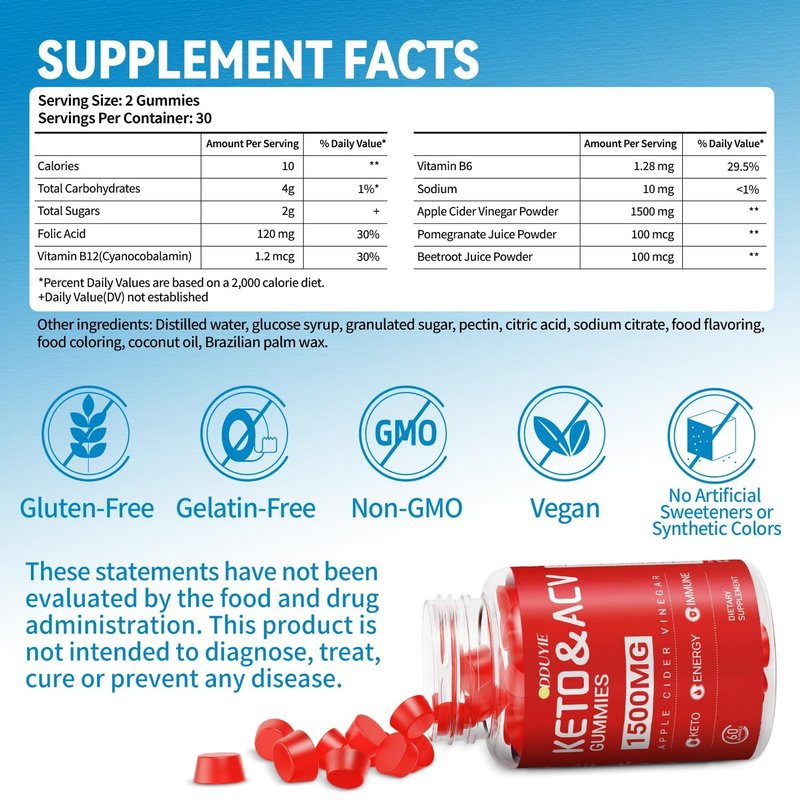 - Enjoy the benefits of keto gummies. Our DDUYIE Keto ACV Gummies contain apple cider vinegar, pomegranate juice, beetroot, and essential vitamins B12 and B6. They support weight loss in a delicious way.